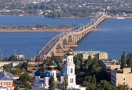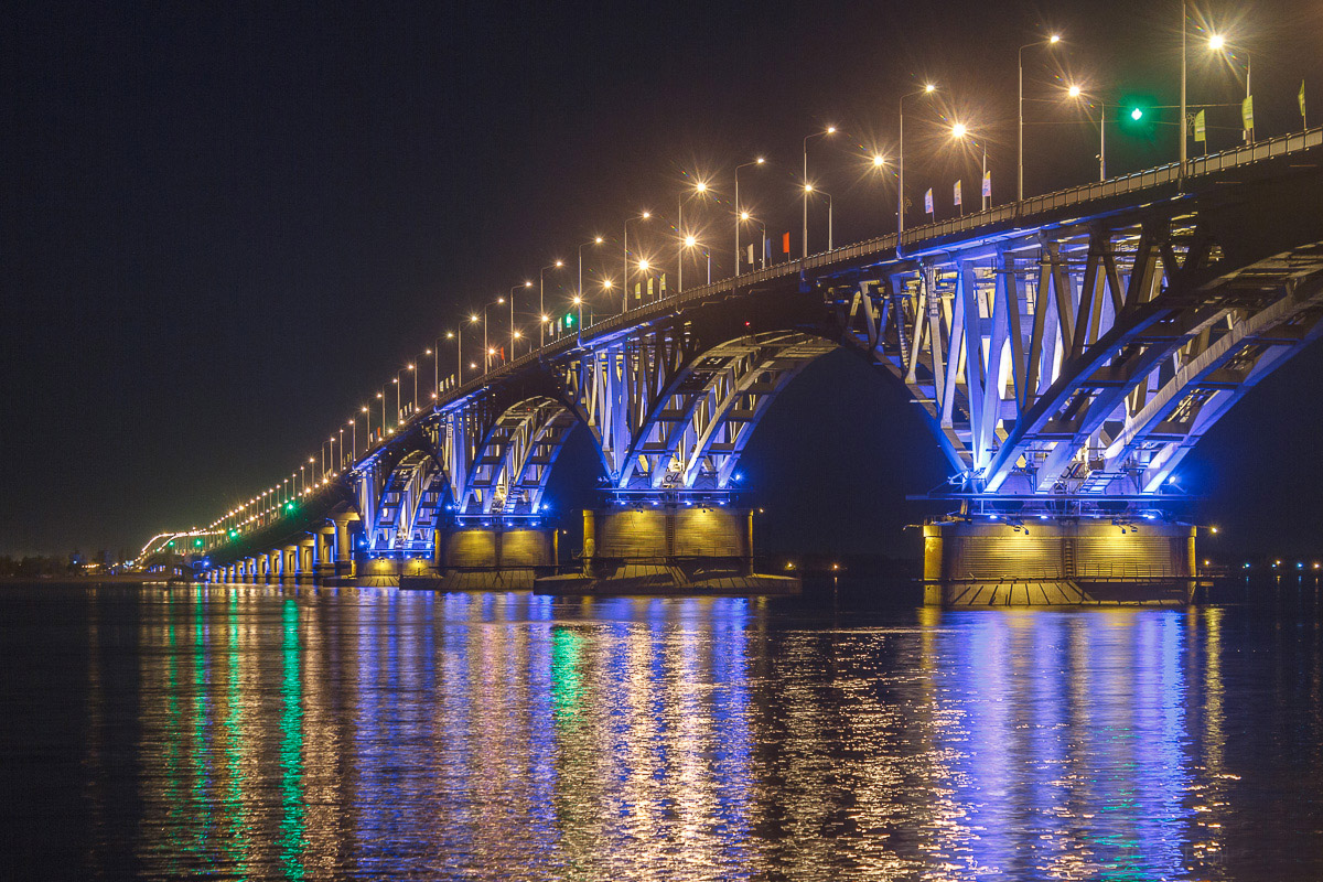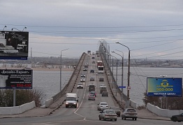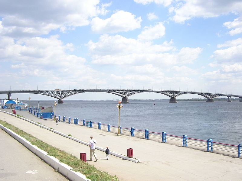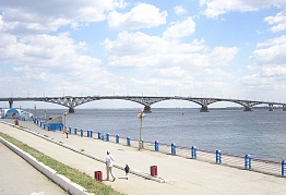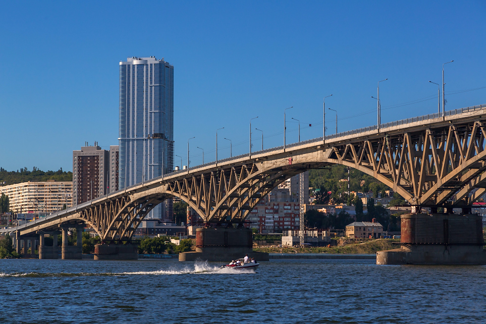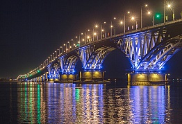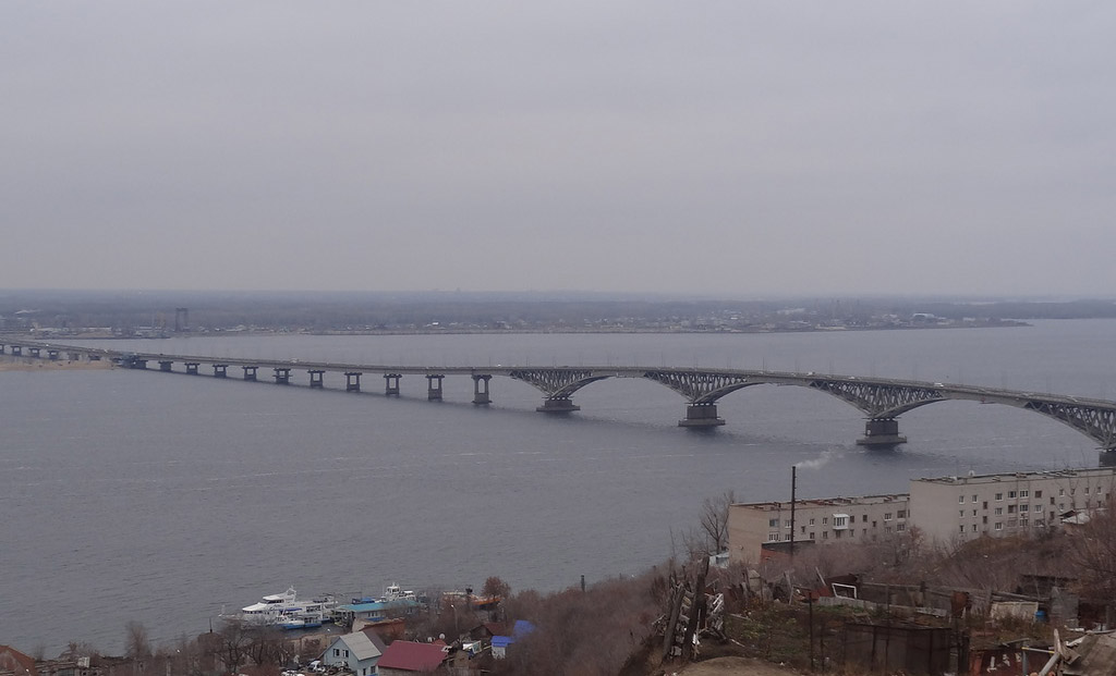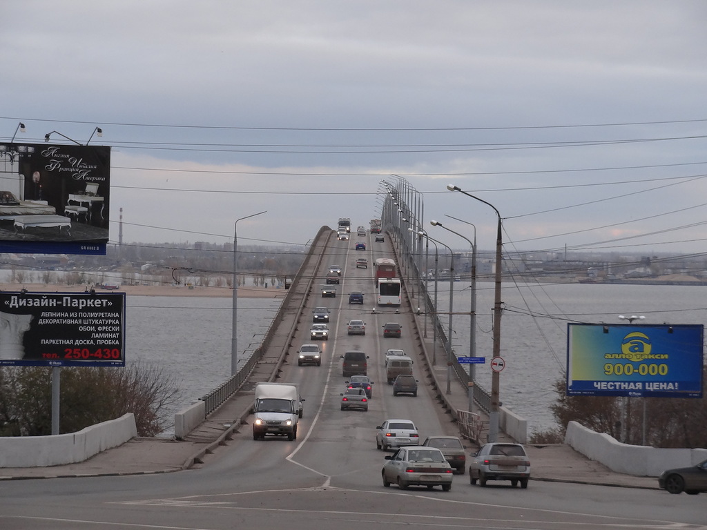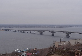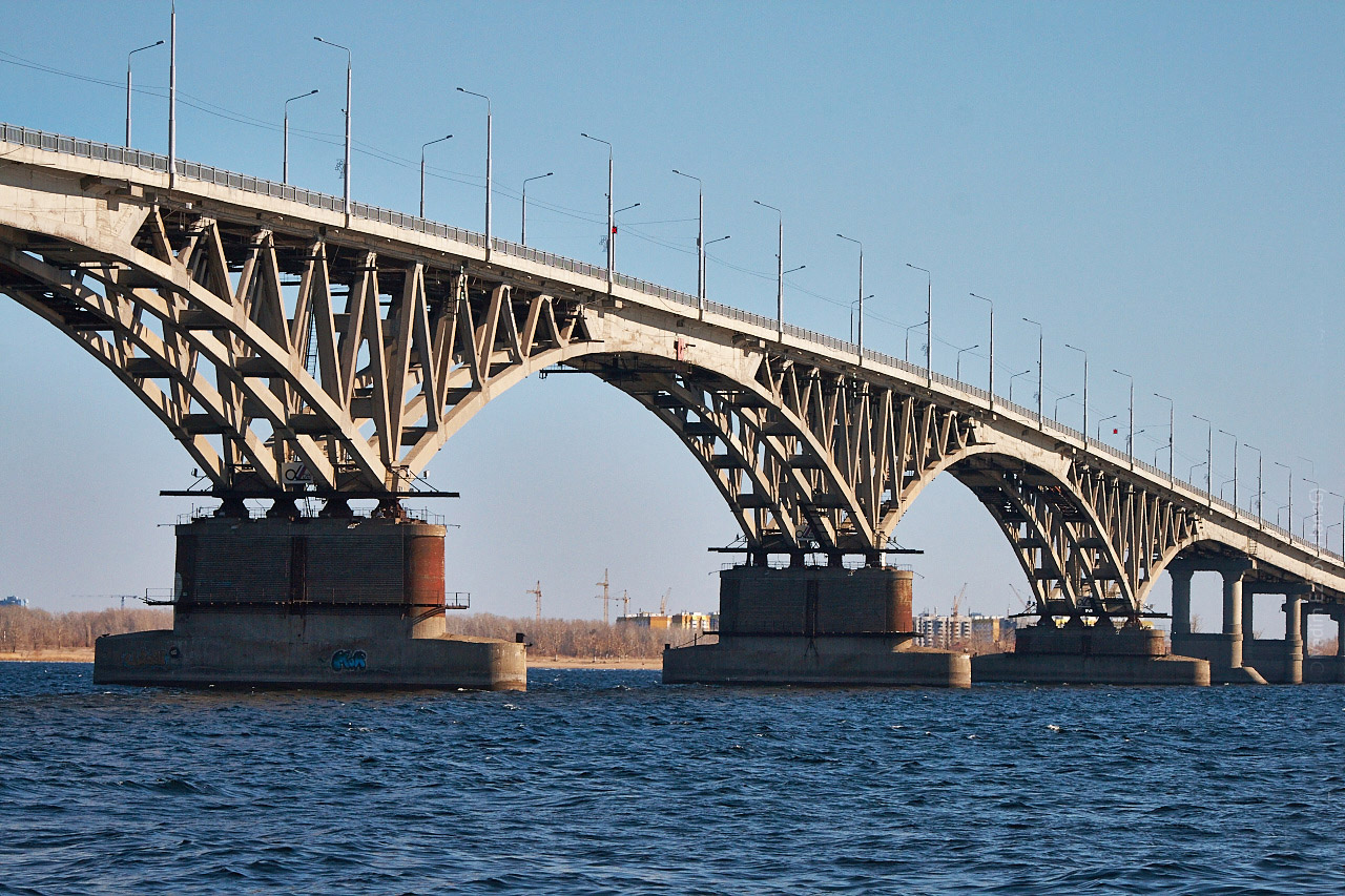 Саратовский мост — автомобильный мост через Волгоградское водохранилище, соединяющий правый берег, на котором стоит город Саратов, и левый — на котором расположен город Энгельс. Проект моста выполнен инженерами института «Гипротрансмост» В. М. Иодзевичем, В. Н. Ивановым и архитектором Б. М. Надежиным. Строительство моста велось под руководством А. А. Баева, инженера мостотряда № 8 (в настоящее время — в составе ОАО «Волгомост») . Утвержденный в марте 1958 года проект Саратовского моста был признан одним из уникальнейших в мостостроении. Спроектированный по новейшей инженерной мысли того времени, экспериментальный мост почти полностью конструировался из сборных железобетонных элементов. Протяженностью 2804 метров и шириной 15 метров на 39 мостовых опорах, он обеспечивает пропуск 3 автополос и двух тротуаров для пешеходов; длина судоходных пролетных строений составляет 166 метров. На Саратовском мосту впервые в мировой практике мостостроения были применены железобетонные сборные балочные пролетные строения длиной 70 метров, а судоходные пролеты перекрыты сборными железобетонными пролетными строениями длиной 166 м, состоящими из надопорных решетчатых конструкций длиной 116 м (весом 2600 т) и 46-метровых сборных железобетонных вставок (вес 400 т). Саратовский городской мост – один из достаточно крупных мостов в мире, полностью сооружённых из железобетона. Для движения мост открыт в 1965 году. По мосту с 22 января 1966 года проходила линия междугородного троллейбуса Саратов — Энгельс (маршрут № 9). Но 23 марта 2004 года произошло падение нескольких опор, поддерживающих контактную сеть. Институт «Проектмостореконструкция» произвел обследование моста. Осмотр конструкций моста показал, что он находится в аварийном состоянии и не сможет впоследствии выдерживать нагрузку, поэтому опоры контактной сети демонтировали полностью. При этом в течение всего апреля мост закрывался с 20:00 до 6 часов утра, в этот промежуток всё движение шло через мост у села Пристанное. Примерно через полгода были смонтированы облегчённые опоры освещения, контактную сеть планировалось восстанавливать по окончании капитального ремонта моста. В период 2005—2013 гг. на мосту велись работы по замене перил ограждения и восстановления тротуаров с обеих сторон, проведена частичная установка стационарных опор освещения. 15 апреля 2014 года на мосту начался ремонт дорожной одежды моста, который планировалось завершить к 1 ноября 2014 года (завершен 29 августа 2014 года). В ходе ремонта были выполнены работы по полной замене дорожного полотна, замене 35 деформационных швов, завершению ремонта тротуаров, установке опор контактной сети с верховой стороны моста. После разборки существующей дорожной одежды предусмотрены работы по обследованию канатной арматуры в плите неразрезного руслового пролётного строения. На период ремонтных работ движение автомобилей по мосту было прекращено, осуществлялись только автобусные пассажирские перевозки. Планируемый срок службы моста после ремонта — 20 лет. После чего возможен его снос или перевод в категорию пешеходных. До этого времени запланировано строительство нового моста в черте города, предположительно в районе Казачьего острова. Саратовский мост на момент открытия в 1965 году был самым длинным мостом в Европе (его длина — 2825,8 метров). На строите