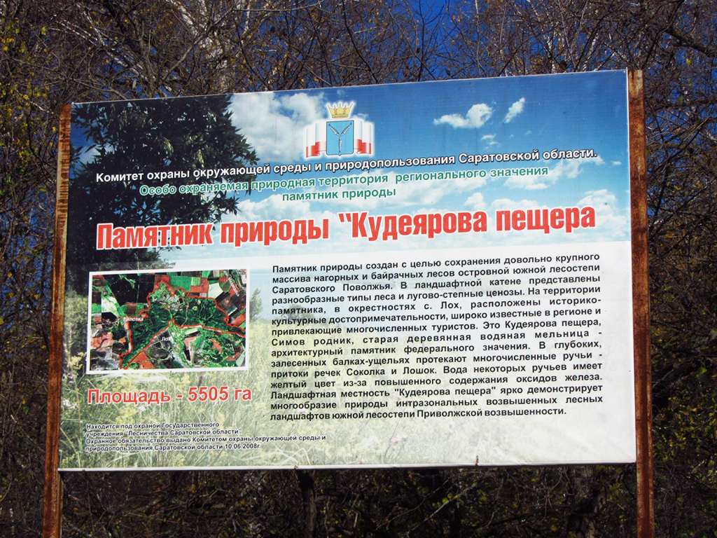 Красивая природа, богатая событиями история, интересные достопримечательности -все это особо охраняемая природная территория «Памятник природы «Кудеярова пещера». Памятник природы создан с целью сохранения довольно крупного массива нагорных и байрачных лесов островной южной лесостепи Саратовского Поволжья. В ланшафтной катене представлены разнообразные типы леса и лугово-степные ценозы. На территории памятника, в окрестностях с. Лох, расположены историко-культурные достопримечательности, широко известные в регионе и привлекающие многочисленных туристов. В залесенных балках-ущельях протекают многочисленные ручьи — притоки речек Соколка и Лошок. Вода некоторых ручьев имеет желтый цвет из-за повышенного содержания окислов железа. Ландшафтная местность «Кудеярова пещера» ярко демонстрирует многообразие природы интразональных возвышенных лесных ландшафтов южной лесостепи Приволжской возвышенности. Комплексный памятник природы «Кудеярова пещера» исключительно интересен по сочетанию природных и культурно-исторических особенностей входящих в него ландшафтов. Памятник расположен в дальней пригородной зоне Саратова. Он занимает западные отроги Приволжской возвышенности. Это довольно крупный массив нагорных и байрачных лесов островной южной лесостепи Саратовского Поволжья. Живописный, сильно расчлененный рельеф местности состоит из глубоких долин-ущелий, оврагов-балок и склонов разных экспозиций, разделяющих водоразделы-гребни, значительно приподнятых над окружающей местностью. Разнообразие ландшафтных обстановок обусловлено активными неотектоническими процессами в зоне так называемых «Саратовских дислокаций». Памятник природы занимает обширную территорию, центром которой является село Лох расположенное в 15 км западне р.п. Новые Бурасы Саратовской области.