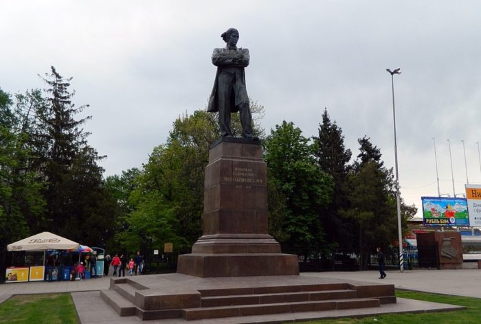 В прошлом на этом месте находился памятник Александру II. Автором первого памятника, появившегося в 1918 году, стал скульптор Дундук. Бюст был выполнен из гипса или бетона и покрыт чёрной краской. Поскольку материалы не способствовали долговечности, объявили конкурс на создание нового памятника. Победила работа Александра Кибальникова. Торжественное открытие памятника, впоследствии ставшего одним из символов Саратова, было приурочено к празднованию 125-летия Чернышевского и состоялось 26 июля 1953 года. За создание скульптуры Н.Г. Чернышевского А.П. Кибальникову была присуждена Государственная премия СССР. В статье "Работа над памятником Н. Г. Чернышевскому" Кибальников писал: "Чернышевский показан в расцвете сил, со взглядом, устремленным в далекое будущее. В правой руке он держит свиток своего литературного произведения - главного оружия, которым он боролся за счастье народа".