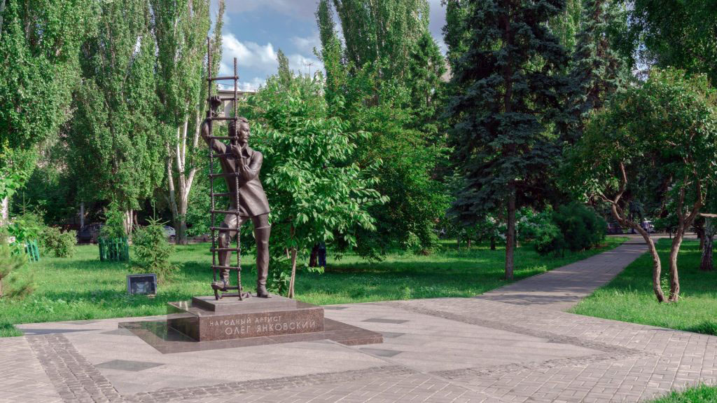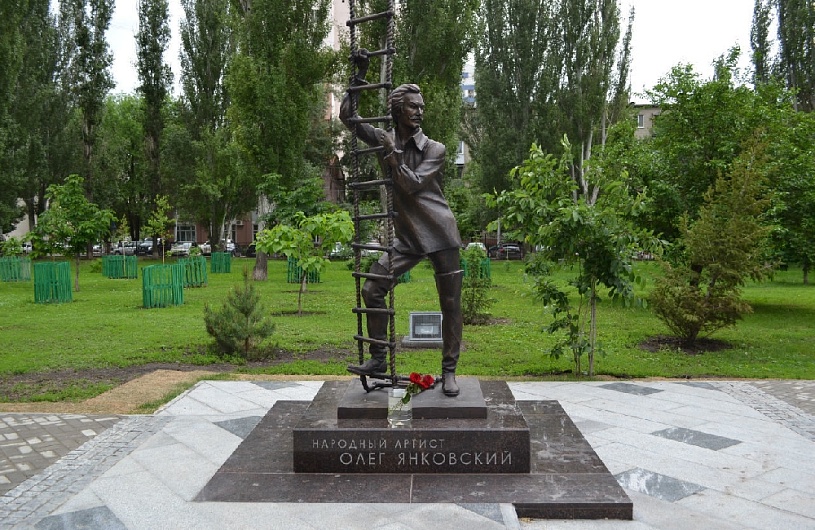 Установлен памятник в сквере им. О.И. Янковского (бывш. сквере им. А. С. Пушкина) напротив Саратовского академического театра драмы. В феврале 2016 года было объявлено об установке в Саратове первого в стране памятника Народному артисту СССР Олегу Янковскому. На тот момент уже был готов эскиз изваяния, которое решено было разместить в сквере у театра драмы, где актёр начинал свой творческий путь. Автором скульптуры стал известный мастер А. А. Щербаков, изобразивший Янковского в образе поднимающегося по лестнице в небо барона Мюнхгаузена из кинофильма "Тот самый Мюнхгаузен". Постамент был выполнен архитектором Д. В. Назимовым в гранитной мастерской С. М. Кулика. Открытие изначально планировалось на сентябрь к началу нового театрального сезона, но в итоге состоялось уже 28 мая. Семья Олега Янковского (1944-2009) перебралась в Саратов из Джезказгана Казахской ССР в 1951 году, в Саратове он окончил школу и местное театральное училище, после чего играл в группе Саратовского драмтеатра. Там его увидел художественный руководитель Московского театра "Ленком" Марк Захаров, позднее пригласивший Янковского в Москву.