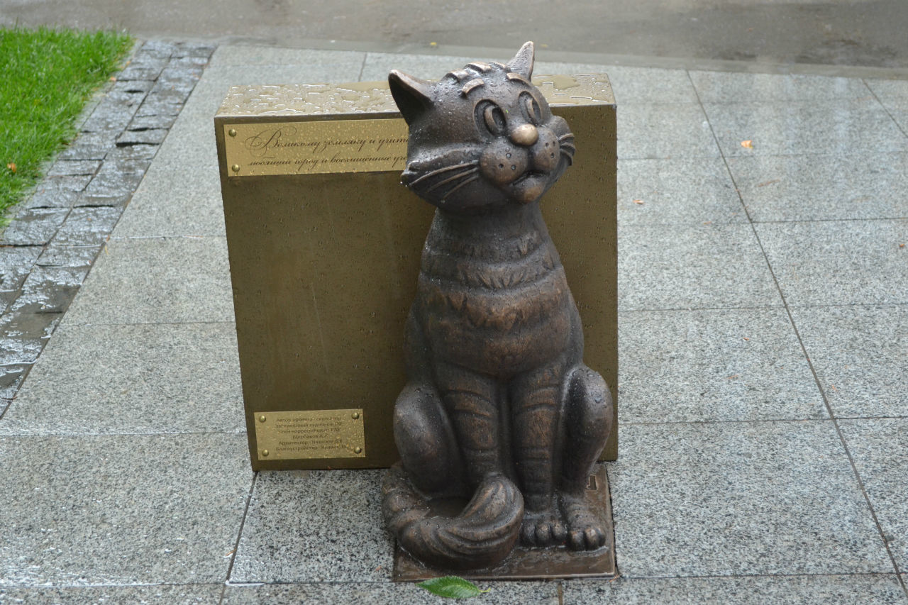 Композиция состоит из двух частей. Первая – шагающий по дорожке Олег Савин, которого Табаков играл в «Шумном дне», вторая – сидящий чуть поодаль кот Матроскин, озвученный Олегом Павловичем в мультфильме «Простоквашино». Позади кота Матроскина две таблички. На одной надпись:" Великому земляку и учителю любящий город и восхищенные ученики". На второй автор этой скульптурной композиции Андрей Александрович Щербаков. Памятник символизирует творческий путь актёра.