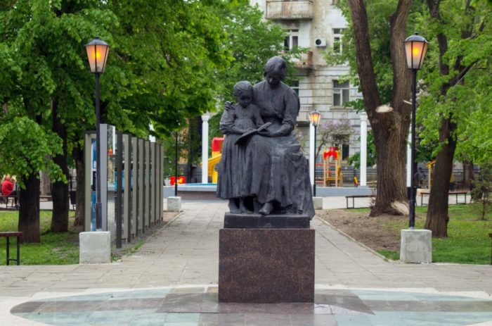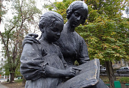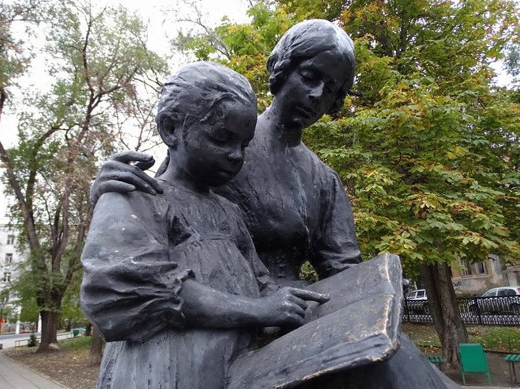 Учительница и стоящая рядом девочка - это фрагмент групповой композиции при памятнике Александру II, который был установлен в 1911 году перед входом в сад "Липки" на Новособорной площади. Памятник выглядел как главная фигура царя на пьедестале в окружении других персонажей. В общей композиции монумента в память об Александре Втором присутствовали скульптурные изображения крестьянина-сеятеля, богини правосудия Фемиды. Фигура женщины-учительницы и её ученицы, символизирующая реформу народного образования, выполнена знаменитым российским скульптором С. М. Волнухиным (1856-1921), создатель памятника первопечатнику Ивану Фёдорову в Москве. После сноса памятника Александру II и переплавки всех остальных его фрагментов в 1918 году скульптура учительницы переносилась в разные места. В 1997 году памятник был перенесён в сквер на Московской улице . После этого сквер был переименован с Октябрьского сквера в сквер Первой Учительницы. Сквер Первой учительницы небольшой, однако очень уютный. Скамейки здесь стоят кругом вокруг памятника, иногда работает небольшой фонтан, ночью светят фонари, есть детская площадка. Теперь памятник находится у пересечения улиц Московской и Соляной недалеко от здания Министерства просвещения Саратовской области. Вот так и случилось, что скульптурная композиция в память о достижениях российского императора Александра Второго, стала самым старым сохранившимся памятником города Саратова.