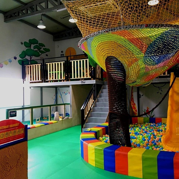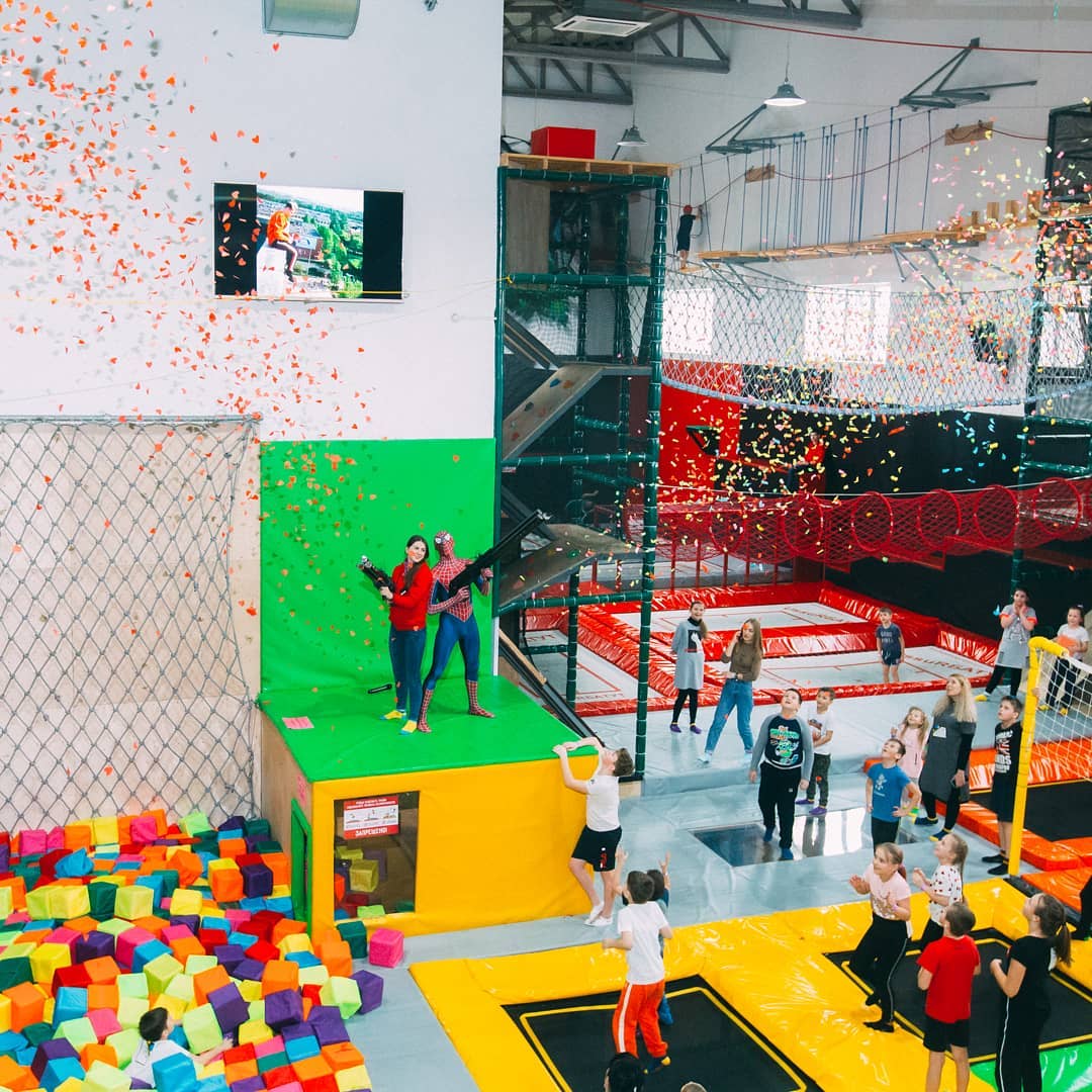 Батутная арена : 21 батут ; Веревочная трасса; Яма для прыжков с кубиками; Подземный лабиринт; Горки. Детский центр : Лабиринт; Детская игровая зона; 5-ти этажный гамак; Конструктор; Сухой бассейн с шариками. Проведите день рождения весело и ярко в этом центре, с аниматором.