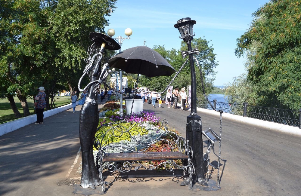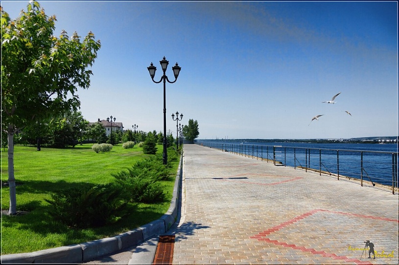 Набережная Энгельса с прошлого века главная пешеходная улица города, во все времена она привлекала горожан прохладой и видами Волги. В архиве сохранились фотографии, где в 1920 году можно было легко спускаться к воде, привязывать за веревку обычные деревянные лодки, а зимой без проблем кататься на коньках. Массовая застройка началась в 40-е годы прошлого столетия. В Энгельсе появились обустроенные причалы, асфальт, кафе и многое другое. Сегодня главная пешеходная улица города цветет и благоухает. Вдоль береговой зоны установлен невысокий декоративный металлический резной заборчик, который, по новому веянию моды, увешан замками молодоженов. Рядом асфальтированные дорожки, беседки, лавочки, урны, кафе и ночные клумбы. С набережной Энгельса хорошо виден Саратов, находящийся на противоположной стороне Волги. Волжский берег здесь сохранен практически в первозданном виде. Это дамба протяженностью в несколько километров, с которой открывается красивый вид на залив и острова. Вы не найдете здесь шумных кафе с громкой музыкой, зато это одно из лучших мест в городе, чтобы побыть наедине со своими мыслями и чувствами. 25 августа 2017 г., на набережной в Энгельсе открыли памятник «Перед полетом...», на котором запечатлены первый космонавт планеты Юрий Гагарин и академик Сергей Королев. На памятнике запечатлены Гагарин и Королев, сидящие на скамейке. Скульптура находится справа от лестничного спуска к Волге. Её окружают четыре кованные арт-объекта, украшающие ближайшие фонари. На четырех фонарях с декоративными деталями изображены виток ракеты вокруг Земли, первый искусственный спутник планеты, космонавт в открытом космосе. В Энгельсе всё больше мест, где хочется побывать, в этом он вполне успешно соревнуется с областным центром. Новые памятники, арт-объекты, парки и фонтаны. В августе 2017 года на набережной появились и обжили её весёлые железные человечки. Это несколько оригинальных кованных арт-объектов. Два кованных фонаря, причем, один мужского, другой женского рода, которые были установлены 10 августа 2017 года. Неунывающий даже в Африке российский турист присел под пальмою. А вот музыка, застывшая в металле, он играет на гитаре, а она вытанцовывает под зажигательную музыку. Есть на набережной и железная любовь. Коленопреклоненный поклонник вручает цветок своей возлюбленной. Детям разных возрастов нравятся эти забавные фигурки, а родители с удовольствием фотографируют на их фоне своих чад.