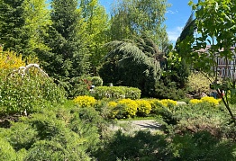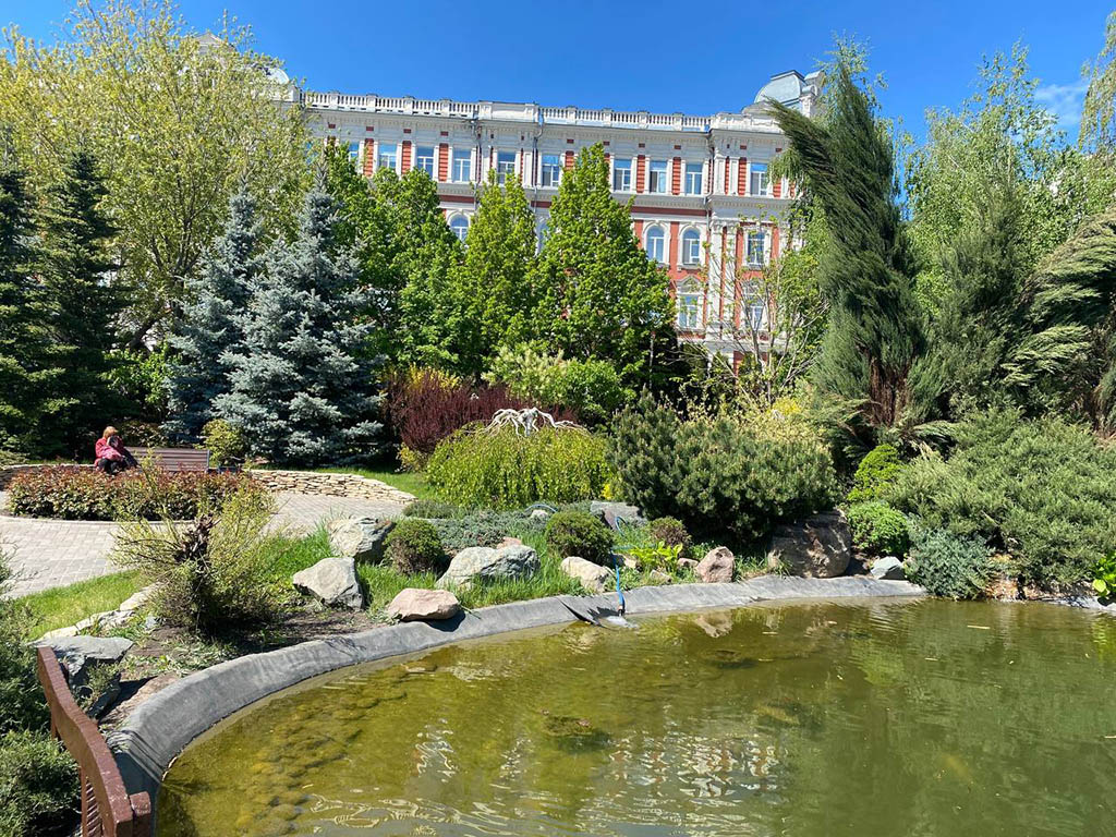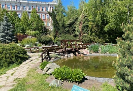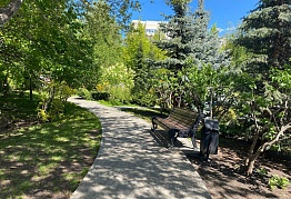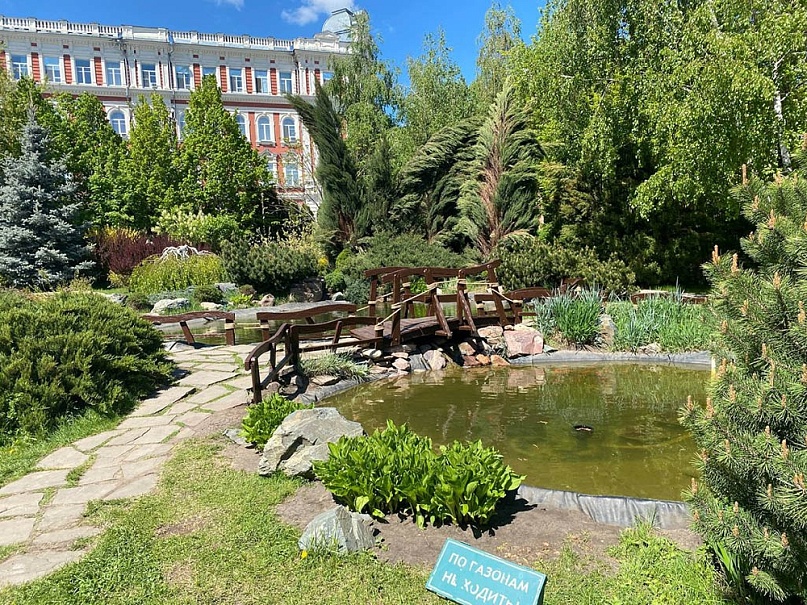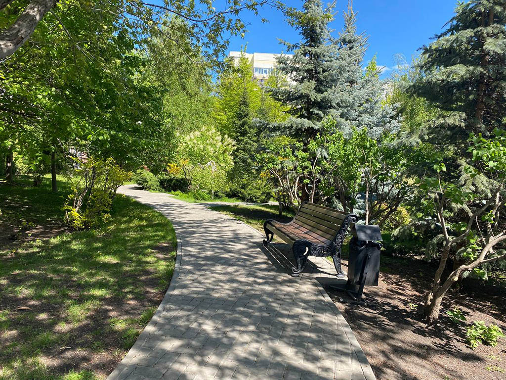 Прекрасным украшением парка является элементы ландшафтного дизайна – «альпийская горка» с ручейком! Камни и растения очень красивы, и им под силу очаровать самый привередливый взор. По замыслу главного архитектора Нины Викторовны Фурман, это естественный водоем, в котором на зиму будут оставаться и вода, и водные растения, и рыбы. Есть и декоративное освещение сквера и уютные, удобные лавочки и детская площадка.