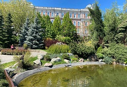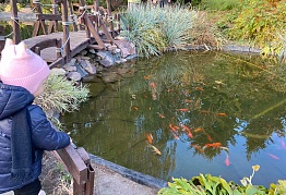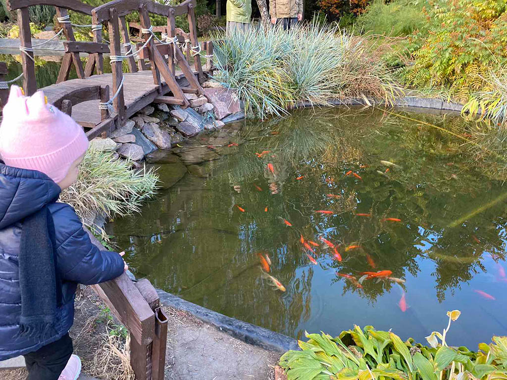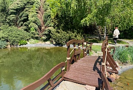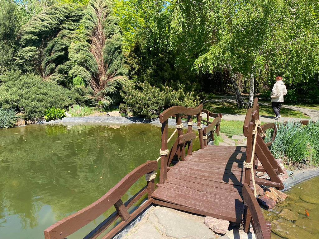 Несомненно, центральное место в парке занимает пруд, точнее – два небольших пруда, соединенные между собой. Их глубина достигает 1,5 и 2,5 м. Вокруг пруда выложены большие горные камни, которые на солнце могут переливаться всеми цветами радуги. Через водную гладь перекинут небольшой мостик, по которому можно будет пройтись и посмотреть на плавающих в пруду рыбок. Непривычные и необычные, очень яркие рыбы, свободно плавающие в пруду, очень нравятся детям.