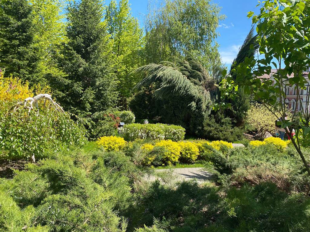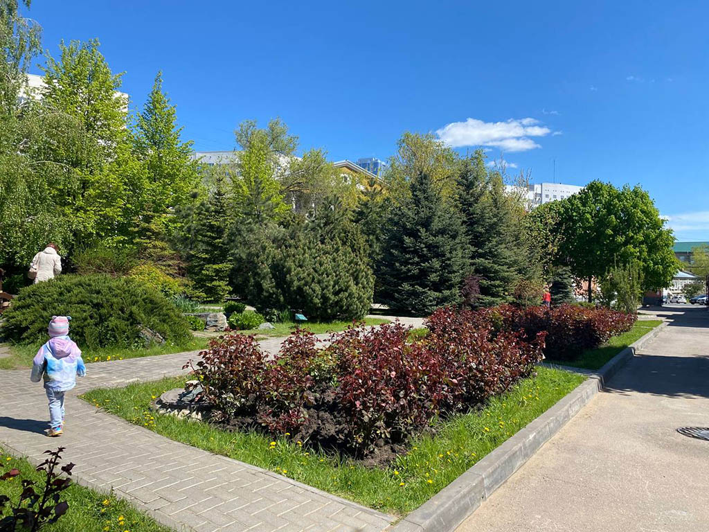 Если вы пройдетесь по дорожкам сквера, то увидите вокруг себя множество прекрасных растений, достаточно редко встречающихся в нашей области. Например, у западной стены вы увидите березовый хоровод, в центре которого – могучая сербская ель. Но и березы не обычные. Это ценный и редкий сорт повислой березы. Их стволы, в отличие от обыкновенных берез, кипельно-белые. Здесь и алый барбарис, и клематис, и раскидистый орех маньчжурский, и сумах, и, конечно же, невероятно красивые розы. В нашем сквере посажено более 200 кустов различных сортов роз.