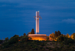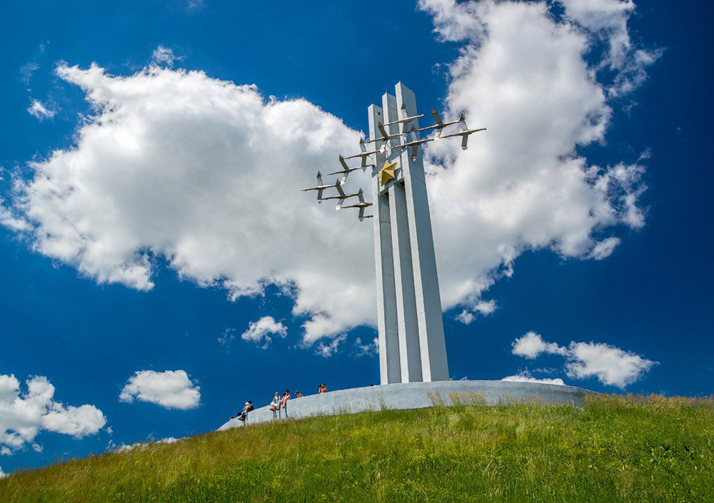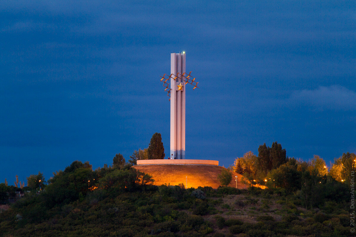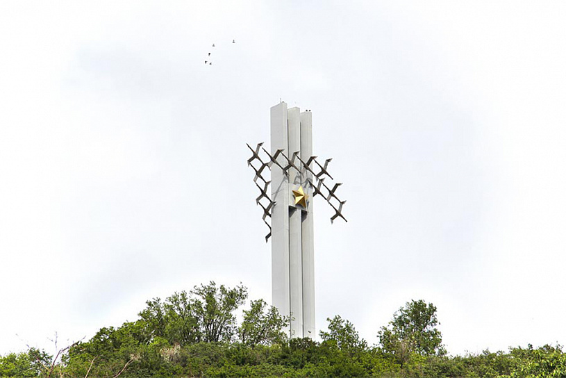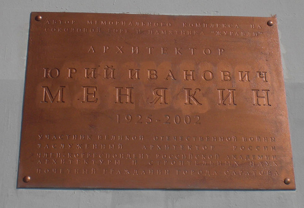 Мемориальный комплекс «Журавли» в парке Победы на Соколовой горе г. Саратова — памятник саратовцам, погибшим в Великой Отечественной войне 1941—1945 гг. Мемориальный комплекс «Журавли», один из символов Саратова. Воздвигнутый на Соколовой горе на высоте 160 метров над уровнем моря, имеющий рукотворный холм высотой 100 метров и установленные на нём сорокаметровые пилоны, позволяют видеть силуэт «Журавлей» из многих точек Саратова и Энгельса, и с 20-километрового расстояния вниз и вверх по Волге. Замысел и архитектурное решение Мемориала навеяны песней «Журавли» на стихи Расула Гамзатова. В 1977 году в Саратове объявили конкурс на лучший проект памятника землякам, погибшим на фронтах Великой Отечественной войны. Победил проект архитектора Ю. И. Менякина. Строительство Мемориала началось весной 1980 года и закончилось в апреле 1982 г. Памятник представляет собой три железобетонных пилона высотой 40 метров со стилизованным изображением двенадцати журавлей, символизирующих души погибших солдат. Интересно то, что одновременно можно видеть только одиннадцать птиц. Журавлиный клин из 12 птиц летящих на Запад, где шли бои с врагом, символизирует бессмертие погибших за Родину. Птицы выполнены из нержавеющего металла. Журавлиный клин — это огромная конструкция; система металлических рам, связанных в замкнутый треугольник; длинные консоли и крепёжные детали. Клюв журавля под напором ветра может колебаться по горизонтали в радиусе до одного метра. 9 Мая 1999 г. перед Мемориальным камнем зажжён Вечный Огонь. На Аллее Славы установлены мемориальные плиты с высеченными на них именами саратовцев — кавалеров Ордена Славы и Героям Советского Союза, Героям России, а также — бюсты дважды Героям Советского Союза. 1999—2014 гг. изменяли трижды Мемориальный камень и его постамент — каждый раз меняя цвет, форму и конструкцию.