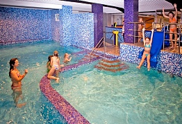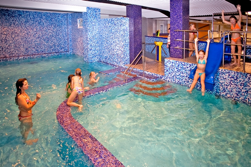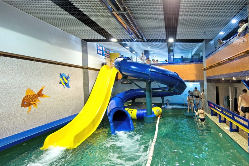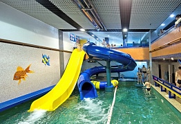 Находящийся в черте города Саратова уютный, комфортабельный и безопасный аквапарк. Набору опций аквапарка позавидует любой курорт. Все знают, что театр начинается с вешалки, а бассейн с системы подготовки и очистки воды, вот почему в нашем бассейне установлена новейшая компьютерная станция для подготовки воды в общественных бассейнах, которой помогают мощные бактерицидные лампы «УФО». Инфракрасные горелки автоматически поддерживают постоянную температуру воздуха, а автоматика подогрева воды держит температуру воды в интервале 27-29С.Основной бассейн имеет размер 25 м на 8 м с перепадом глубин от 0,8 м до 1,8 м. В нем расположены 2 водные горки — открытая горка «Камикадзе» и закрытая горка «Черная дыра», 2 гидромассажных бассейна «СПА» с температурой воды 38 С и опциями гидровоздушного массажа, У аквапарка есть и второй уровень, не менее интересный чем первый. Кроме стартовой площадки для водных горок, там расположен детский бассейн глубиной всего 0,6 м с горкой для детей ясельного возраста. Также на втором уровне аквапарка расположен бассейн глубиной 0,9 м размером 12 м на 5 м с водными аттракционами: противоток, водопад, воздушный гейзер, гидромассаж и душ-шарко. Имеется крытый всесезонный каток площадью 350 м2 с синтетическим льдом Super-Glide. Территория катка оборудована мужскими и женскими раздевалками, сан. узлом, зоной отдыха, есть возможность сделать заказ из кафе клуба или кислородного бара. Полы раздевалок, коридоров и подсобных помещений выполнены из толстого резинового покрытия, что позволяет передвигаться, не боясь затупить коньки. Каток оборудован музыкальной техникой и иллюминацией. Спортивный комплекс клуба включает в себя несколько направлений: 1. Крытый манеж площадью 600 м2 с покрытием, выполненным по бестравматической технологии, позволяет проводить любые спортивные мероприятия, с участием большого количества спортсменов и зрителей. Отличное освещение зала и продуманная вентиляция позволяет проводить тренировки и соревнования по большому теннису, мини-футболу, волейболу и баскетболу. 2. Зал фитнеса и спортивных единоборств площадью 200 м2 позволяет проводить тренировки и занятия по фитнесу, художественной гимнастике, восточным танцам, боксу, борьбе, дзю-до и т. д. 3. Тренажерный зал площадью 180 м2 укомплектован современным профессиональным оборудованием включающим тренажеры Dynamax.PRO, кардиотренажеры Cateye, Kraft и свободными весами с гантельным рядом от 1 до 50 кг.